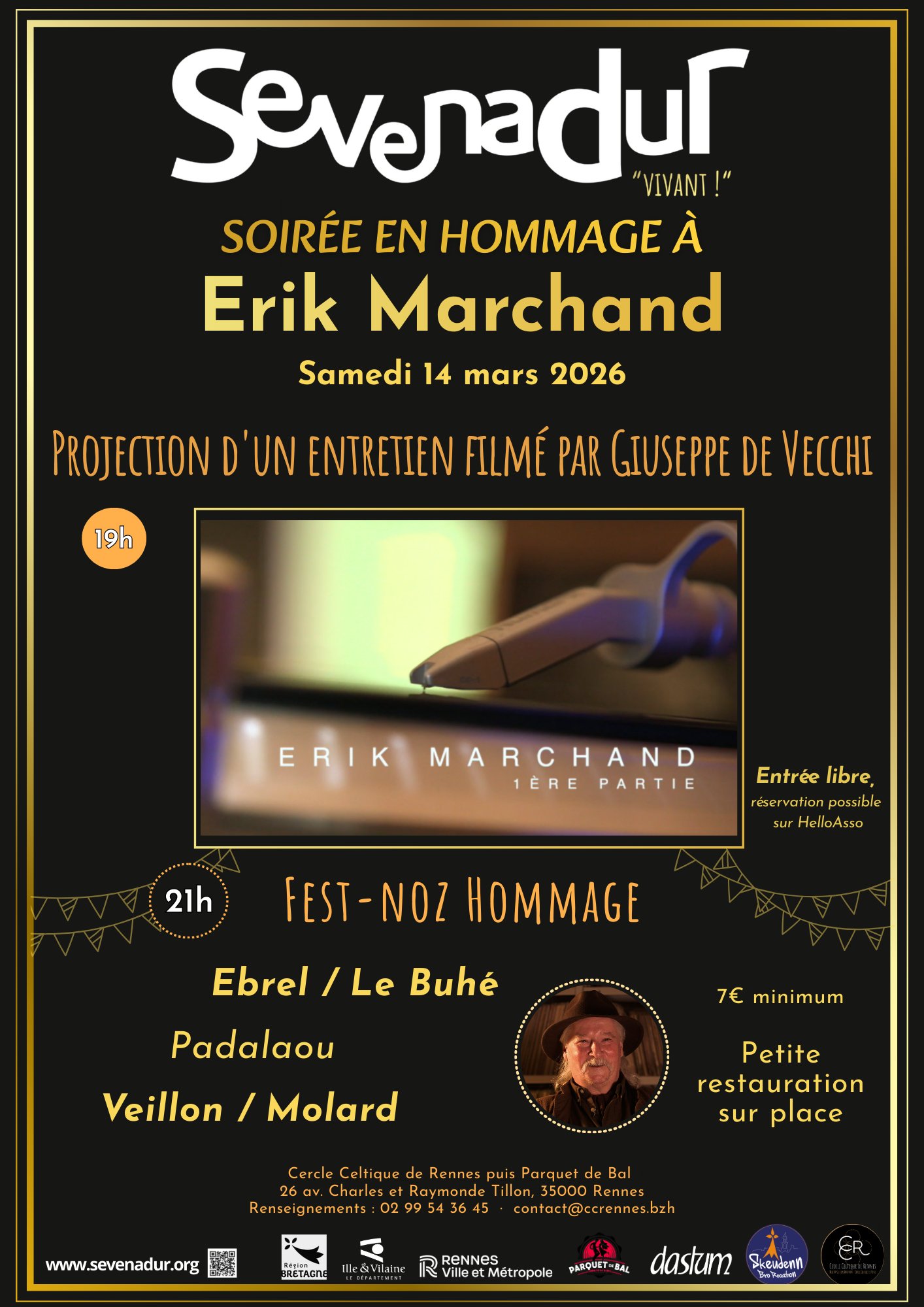 Soirée en hommage à Erik Marchand Les associations Dastum, Skeudenn Bro Roazhon et le Cercle Celtique de Rennes vous proposent une soirée en hommage à Erik Marchand avec en première partie une projection d'un entretien