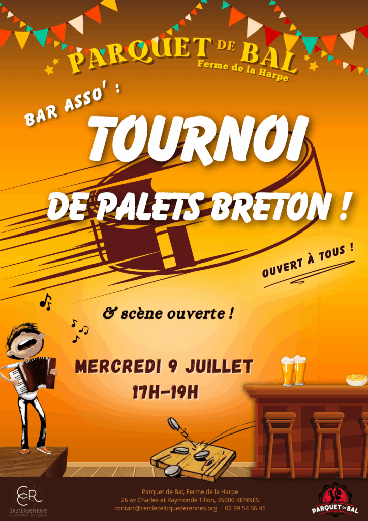 À l’occasion du Bar Asso’ de ce mercredi (9 juillet), nous organisons, en plus de la scène ouverte, un tournoi de palets bretons ouvert à tou·te·s (adhérents ou non). Vous pouvez jouer en équipe ou en solo. Des lots surprises seront à gagner !