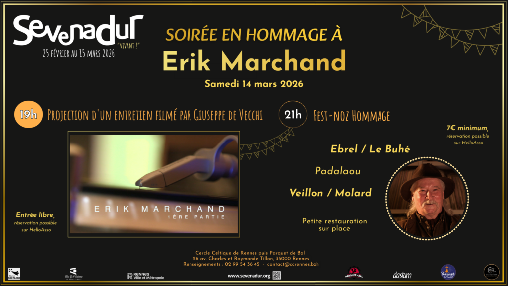 Les associations Dastum, Skeudenn Bro Roazhon et le Cercle Celtique de Rennes vous proposent une soirée en hommage à Erik Marchand avec en première partie une projection d’un entretien filmé suivi d’un fest-noz.