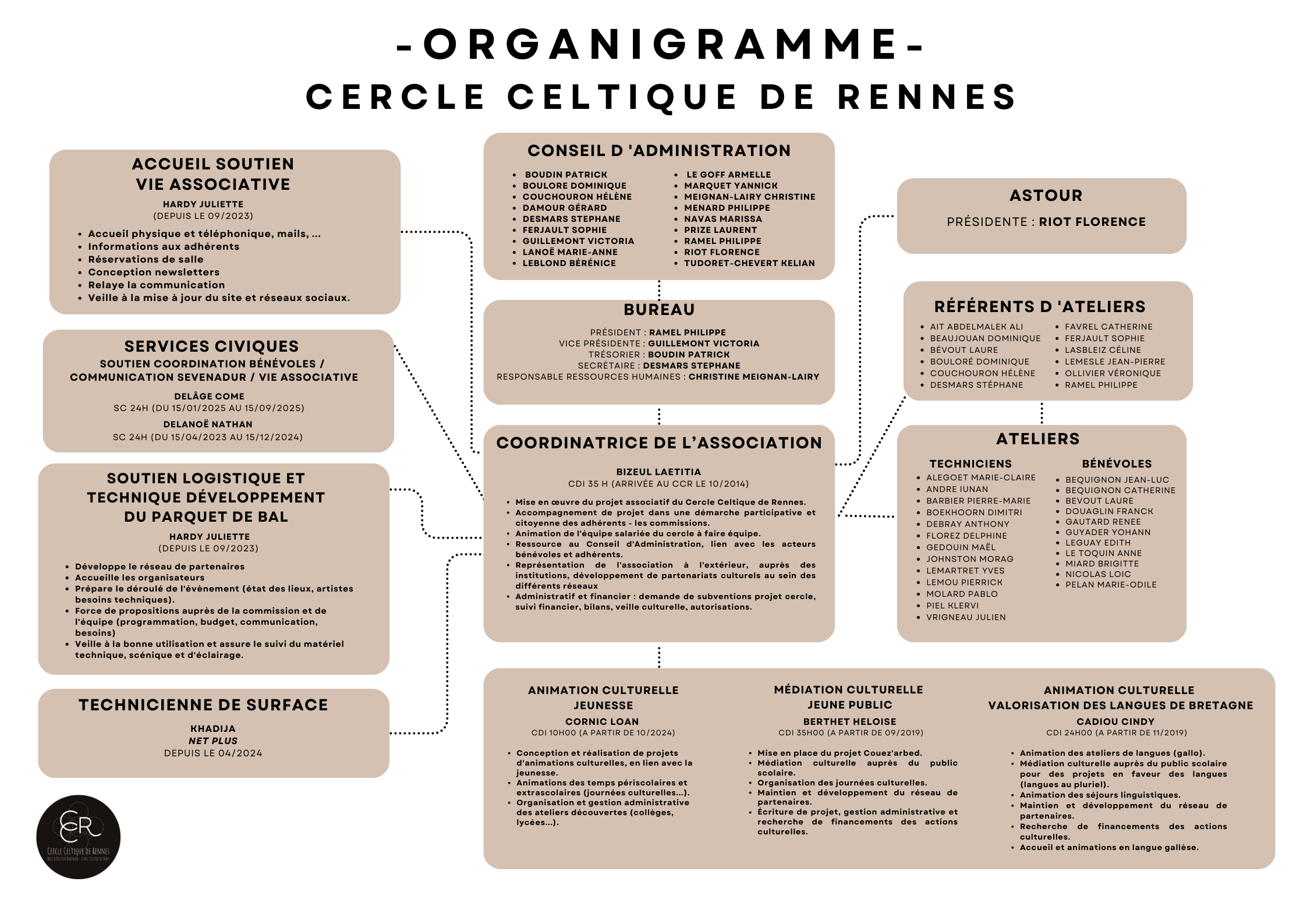 Comme toute association de loi 1901, le Cercle celtique de Rennes fonctionne de manière collaborative, reposant sur l’engagement collectif de ses membres. Dès qu’un adhérent rejoint l’association, il y trouve sa place et devient un acteur à part entière. Le bon fonctionnement de la structure dépend de la participation active de chacun — salariés, adhérents et élus — dont les compétences variées permettent d’influencer et de faire évoluer la vie associative.