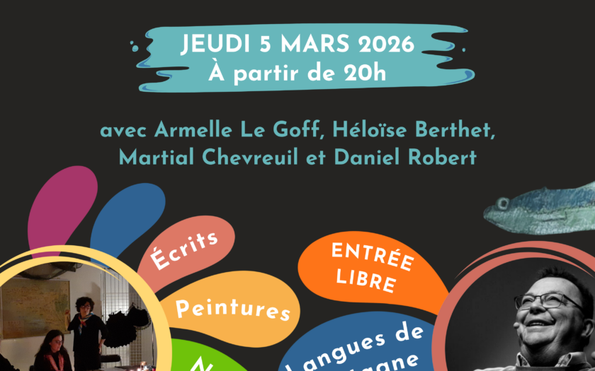 Continue reading“Couleurs du vivant” écrits et peinture de la nature bretonne et contes en gallo. Armelle, Héloïse et Martial vous propose une lecture à plusieurs voix (en français et breton) de textes du patrimoine autour des
