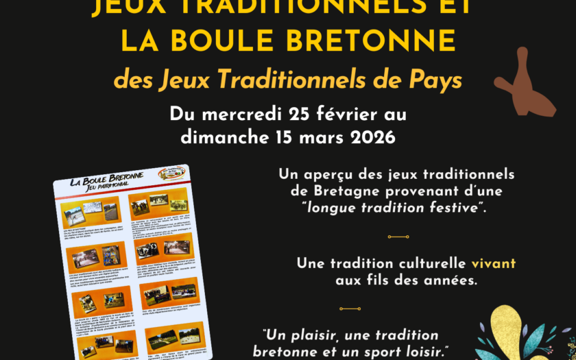 Une exposition de l’association Jeux Traditionnels de Pays L’association vous propose de découvrir les jeux traditionnels de Bretagne : des jeux d’adresse et de réflexions. Vous pourrez également y découvrir l’histoire et les évolutions du